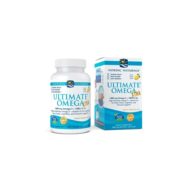 Ultimate Omega® Xtra z dominacją EPA łączy czysty olej rybny o dużej sile działania z 1000 IU witaminy D3, zapewniając silne wsparcie dla kości, stawów, nastroju oraz zdrowego serca i mózgu. <div id="description">SKŁAD:SkładnikiW dziennej porcji (2 kapsułki)Kalorie 20 kcal Kalorie z tłuszczu 20 kcal Całkowita zawartość tłuszczu 2 g Tłuszcze nasycone 0.1 g Tłuszcze trans 0 g Witamina D3 25 mcg Całkowita zawartość kwasów Omega-31480 mg EPA (kwas eikozapentaenowy) 850 mg DHA (kwas dokozaheksaenowy) 425 mg Inne omega-3 205 mgInne składniki:oczyszczony olej z ryb głębinowych (z anchois, sardynek), żelatyna, woda, gliceryna, naturalny aromat cytrynowy, d-alfa-tokoferol, ekstrakt z rozmarynu, witamina D3 (cholekalcyferol w oliwie z oliwek).SPOSÓB UŻYCIA:2 kapsułki dziennie z posiłkiemPRZECIWWSKAZANIA:Nie należy przekraczać zalecanej porcji do spożycia w ciągu dnia. Suplementy diety nie mogą być stosowane jako substytut (zamiennik) zróżnicowanej diety.Należy zachować ostrożność w przypadku uczulenia na jod, stosowania produktów rozrzedzających krew lub planowanej operacji.SPOSÓB PRZECHOWYWANIA:Przechowywać w suchym i chłodnym miejscu, w sposób niedostępny dla małych dzieci.