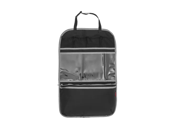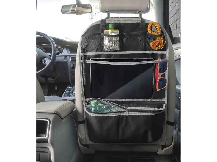 Praktyczna pomoc w utrzymaniu porządku w aucie uniwersalny rozmiar – pasujący do wszystkich standardowych siedzeń w samochodzie ułatwione mocowanie za pomocą elastycznej tasiemki i pętli zakładanej na zagłówek z regulowanym zapięciem klipsowym łatwo zmywalny – chroni tył siedzenia przed zanieczyszczeniem wykonany z wytrzymałego materiału o wzmocnionych krawędziach z kieszenią chłodzącą