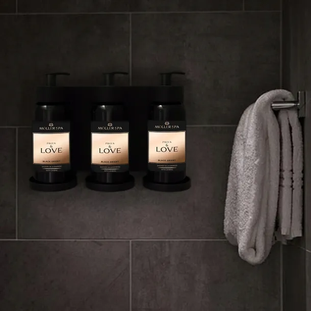 Konstrukcja umożliwia stabilne i estetyczne umieszczenie kosmetyków, zapewniając wygodny dostęp do produktu oraz utrzymanie porządku w przestrzeni użytkowej. Dozownik doskonale sprawdza się w obiektach hotelowych, strefach SPA, łazienkach oraz innych przestrzeniach o podwyższonym standardzie, gdzie liczy się funkcjonalność, higiena i spójny wygląd wyposażenia.