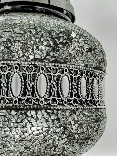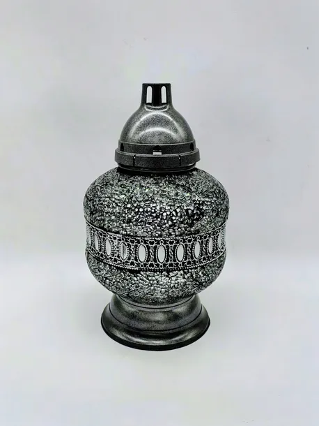Elegancki znicz w grafitowo-srebrnej kolorystyce, wykonany ze szkła z dekoracją mozaikową nakładaną ręcznie. Korpus znicza ma kształt kulisty — w całości pokryty jest drobną, nieregularną mozaiką z kawałków lustrzanego szkła na ciemnografitowym tle, mieniącą się srebrzystym blaskiem. Środkową część korpusu zdobi efektowny, poziomy pas z ornamentem w stylu orientalnym — białe, owalne medaliony osadzone w czarnym tle, otoczone ażurowym, srebrnym wzorem przypominającym koronkę. Znicz ten różni się od poprzedniej wersji głębszą, ciemniejszą kolorystyką mozaiki, co nadaje mu bardziej surowy i wyrazisty charakter. Przy zapalonym zniczu całość olśniewająco migoce i rozsyła dookoła chłodne, srebrzyste refleksy światła, tworząc wyjątkowo efektowną grę blasku. Plastikowa podstawa oraz pokrywa w kolorze antracytu z metalicznym połyskiem nadają zniczowi stonowany, elegancki wygląd, doskonale komponując się z nagrobkami z jasnego i ciemnego kamienia.