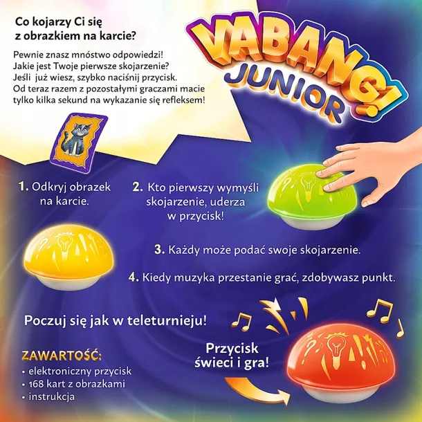 Vabang Junior to gra towarzyska, w której liczy się refleks, bo wszyscy grają jednocześnie. Poczuj się jak w teleturnieju! Jako pierwszy wymyśl skojarzenie związane z obrazkiem na karcie i naciśnij przycisk! Przycisk zacznie świecić i odtwarzać melodię. Uważaj! W tym czasie Twoi przeciwnicy mogą udzielić swojej odpowiedzi i przejąć punkt. Macie tylko kilka sekund na wymyślenie swoich skojarzeń. Rozwijaj spostrzegawczość, kreatywność i ćwicz szybkość działania! Myśl niestandardowo i zaskocz przeciwników. Postaw wszystko na Vabang!Gra Vabang Junior przeznaczona jest dla 2-8 graczy powyżej 6. roku życia, a przewidywany czas rozgrywki wynosi 20-30 minut. Opakowanie zawiera elektroniczny przycisk, 168 kart z obrazkami oraz instrukcję.Cechy gry: Gra towarzyskaPoczuj się jak w teleturnieju! Działaj szybko i przejmuj punkty rywali!Idealna dla dorosłych oraz dzieci od 6. roku życiaGra rozwija:Spostrzegawczość i szybkość działaniaKreatywnośćZdolność zdrowej rywalizacjiPoznaj Gry Trefl i podziel się radością z planszowe to doskonały prezent z okazji urodzin, Dnia Dziecka lub pod choinkę. Świetnie sprawdzą się podczas spotkania towarzyskiego oraz chwil spędzanych w gronie rodzinnym. Zawartość pudełka:elektroniczny przycisk 168 kart z hasłami instrukcjaWymiary pudełka: 260x260x80Ilość Graczy: 2-8Średni czas rozgrywki: 20-30 minWiek: 6+