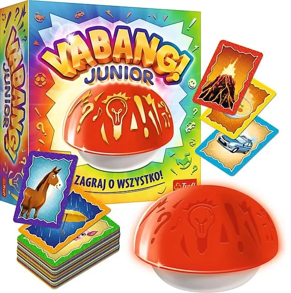 Vabang Junior to gra towarzyska, w której liczy się refleks, bo wszyscy grają jednocześnie. Poczuj się jak w teleturnieju! Jako pierwszy wymyśl skojarzenie związane z obrazkiem na karcie i naciśnij przycisk! Przycisk zacznie świecić i odtwarzać melodię. Uważaj! W tym czasie Twoi przeciwnicy mogą udzielić swojej odpowiedzi i przejąć punkt. Macie tylko kilka sekund na wymyślenie swoich skojarzeń. Rozwijaj spostrzegawczość, kreatywność i ćwicz szybkość działania! Myśl niestandardowo i zaskocz przeciwników. Postaw wszystko na Vabang! Gra Vabang Junior przeznaczona jest dla 2-8 graczy powyżej 6. roku życia, a przewidywany czas rozgrywki wynosi 20-30 minut. Opakowanie zawiera elektroniczny przycisk, 168 kart z obrazkami oraz instrukcję.Cechy gry: o Gra towarzyskao Poczuj się jak w teleturnieju! Działaj szybko i przejmuj punkty rywali!o Idealna dla dorosłych oraz dzieci od 6. roku życia Gra rozwija:o Spostrzegawczość i szybkość działaniao Kreatywność o Zdolność zdrowej rywalizacji Poznaj Gry Trefl i podziel się radością z rozgrywki. Gry planszowe to doskonały prezent z okazji urodzin, Dnia Dziecka lub pod choinkę. Świetnie sprawdzą się podczas spotkania towarzyskiego oraz chwil spędzanych w gronie rodzinnym. Zawartość pudełka:o elektroniczny przycisk o 168 kart z hasłami o instrukcja