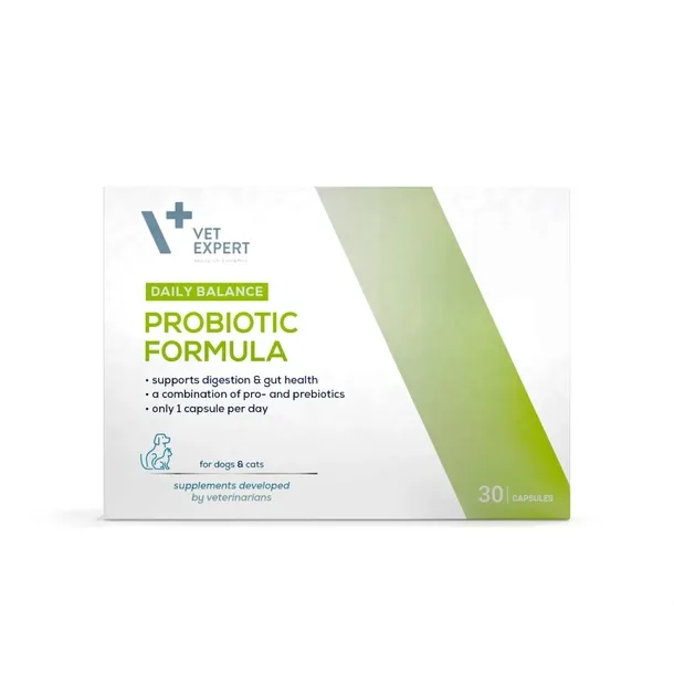 Vet Expert ProBiotic Formula to suplement diety opracowany z myślą o wspieraniu zdrowia przewodu pokarmowego psów i kotów. Preparat łączy działanie probiotyczne i prebiotyczne, pomagając utrzymać prawidłową równowagę mikroflory jelitowej oraz wspierając naturalne procesy trawienne i odpornościowe organizmu.