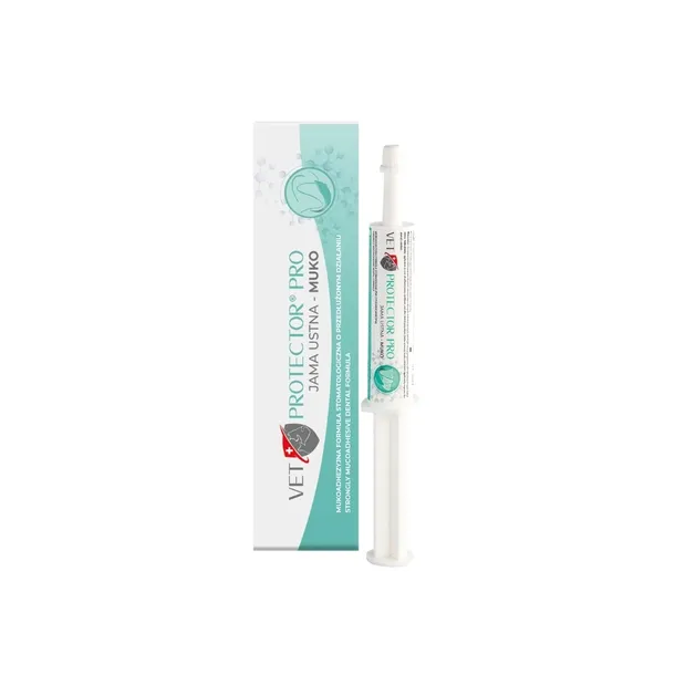 Specjalistyczna linia produktowa VET PROTECTOR JAMA USTNA. MUKO został stworzony w trosce o jamę ustną zwierząt. VET PROTECTOR PRO JAMA USTNA – MUKO to preparat do jamy ustnej psów i kotów w formie przylegającej formuły. Preparat dentystyczny dla psa i kota działa przeciwko drobnoustrojom.
