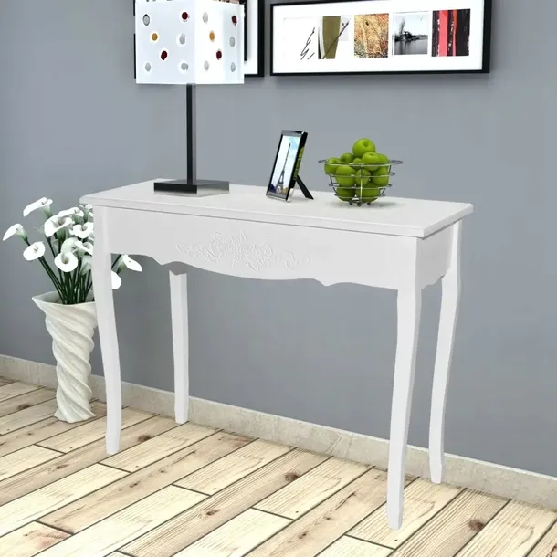 Nasza konsola o prostej lecz ponadczasowej formie będzie znakomitym dodatkiem do Twojego salonu, jadalni, korytarza i innych pomieszczeń. Stolik łączy znakomite wykonanie z funkcjonalnością. Dzięki kompaktowej formie zajmuje on bardzo mało miejsca i pasuje do mniejszych wnętrz. Dekoracja roślinna dodaje mu jeszcze uroku. Ta toaletka wykonana jest z wysokiej jakości płyty MDF oraz drewna sosnowego z białym wykończeniem, co zapewnia wiele lat użytkowania.