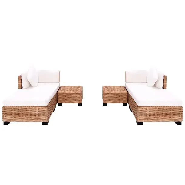 Ten stylowy i funkcjonalny zestaw mebli będzie świetnym dodatkiem do Twojego salonu lub ogrodu zimowego! Rama pokryta jest naturalnym rattanem, który jest nie tylko atrakcyjny ze względu na naturalny wygląd i dekoracyjny, przeplatany wzór, ale również wytrzymały. Nóżki sofy wykonane są z wysokiej jakości drewna mahoniowego. Poduszki dodają wygody i przytulnego wyglądu. Montaż mebli jest prosty. Cały zestaw doda rustykalnego charakteru do Twojego domu! Przesyłka zawiera 2 segmenty narożnikowe, 2 pufy, 2 stoliki kawowe, 2 poduszki do siedzenia, 4 poduszki na oparcia, 2 poduszki na pufy, 2 poduszki ozdobne Maksymalnie 110 kg na siedzisko. Należy mieć świadomość ryzyka związanego z używaniem otwartego ognia i innych źródeł ciepła w pobliżu produktu.