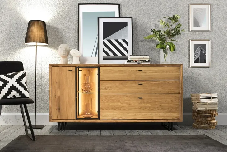 szczegóły, takie jak podświetlana ściana tylna, oraz loftowe dodatki ustawiają ten mebel idealnie na ścianie. Model Vigo