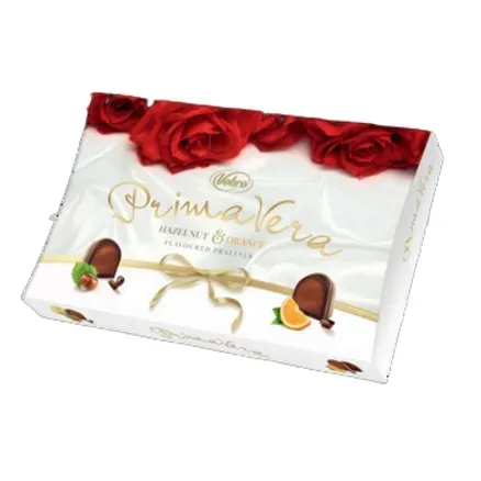 Praliny z czekolady (50%) z nadzieniem o smaku pomarańczowym i orzechowym.