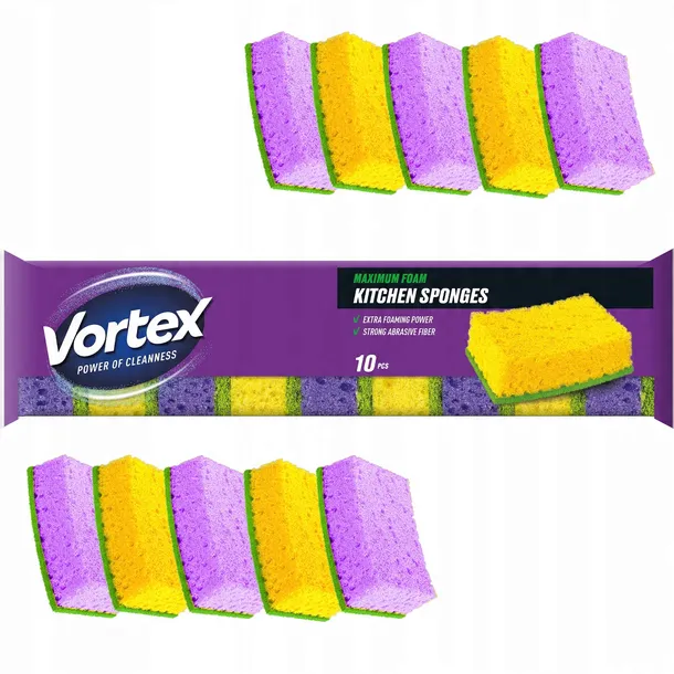 Gąbki kuchenne, Vortex, zestaw 10 sztuk, trwałość, ergonomiczny kształt, pianka poliuretanowa, warstwa ścierna, mycie naczyń, sprzątanie kuchni, czyszczenie, higiena, garnki, patelnie, talerze, sztućce, blaty kuchenne, zlew, łazienka, miękka warstwa, szorstka strona, usuwanie zabrudzeń, komfort użytkowania, skuteczne czyszczenie, bezpieczne w użytkowaniu, wygodny chwyt, detergenty, wymiana gąbki, szybkie schnięcie, dezynfekcja, zmywarka, żywotność, oryginalne opakowanie, Biosfera Polska, Lublin, Polska, superchłonność, do teflonu, produkt nowy, kod producenta, nazwa handlowa, zmywak kuchenny, produkt wytrzymały, foliapak, pakowanie, produkt zaawansowany.