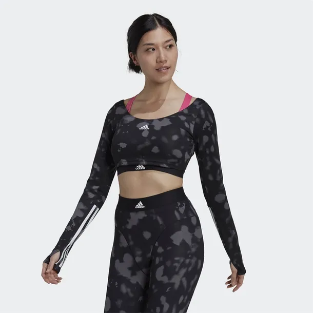 Bluza adidas pentru femei W HYGLM CRO AOP (Women Hyperglam Crop Top All-Over Print), din gama Performance, este pentru cele care isi doresc sa duca stralucirea in sala de sport. - Cu continut reciclat (60%). - Croi mulat. - Decolteu generos. - Maneci cu orificii pentru degetul aratator. - Melanj elastic.