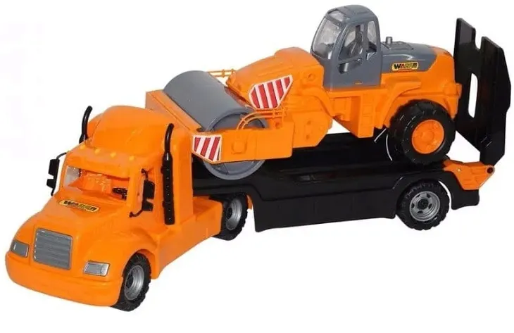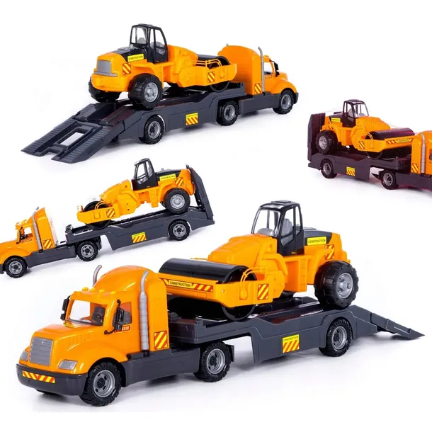 Ciężarówka Volvo z naczepą z najazdem - lawetą, na której znajduje się duży walec. Naczepa posiada otwieraną klapę, po której walec może zjechać / wjechać. Naczepę można wyczepić z ciężarówki.