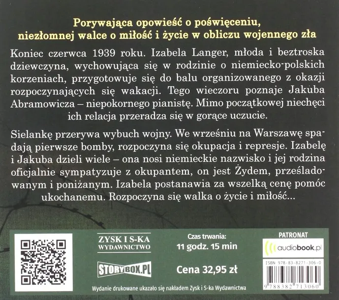Przyłóż ucho do książki, a usłyszysz, jak pewien młodzieniec gra na fortepianie walc dla pięknej dziewczyny. Izę i Jakuba dzieli wszystko, łączy jedynie miłość. W rzeczywistości, gdzie dominuje zło, nienawiść i ból, tylko prawdziwe uczucie potrafi przeciwstawić się wojennemu szaleństwu i utrzymać przy życiu. Debiut Natalii Thiel porwie was od pierwszych stron i nie pozwoli odetchnąć dopóty, dopóki nie przeczytacie ostatniego zdania. O tej powieści nie da się zapomnieć.