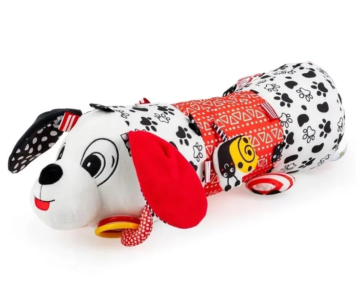Piesio Pedro najlepszym przyjacielem każdego malucha! Ten wielofunkcyjny wałek stanowić będzie wsparcie dla dziecka leżącego na brzuszku. Zdobią go przeróżne ozdoby i zabaweczki, których zadaniem jest pobudzić zmysły bobasa i zapewnić mu rozwojową zabawę. Znajdziemy tu grzechoczące kółeczko, piszczałkę, kolorowe elementy, a także tasiemkę do przeciągania, którą z jednej strony zdobi materiałowy ślimaczek, a z drugiej strony, miękki gryzak z wypustkami, który przyniesie ulgę podczas ząbkowania. Uszy psiaka wesoło szeleszczą. Wałek wykonany został z materiałów o zróżnicowanych fakturach i kontrastowych kolorach, co pomoże maluchowi rozwijać zdolności poznawcze.
