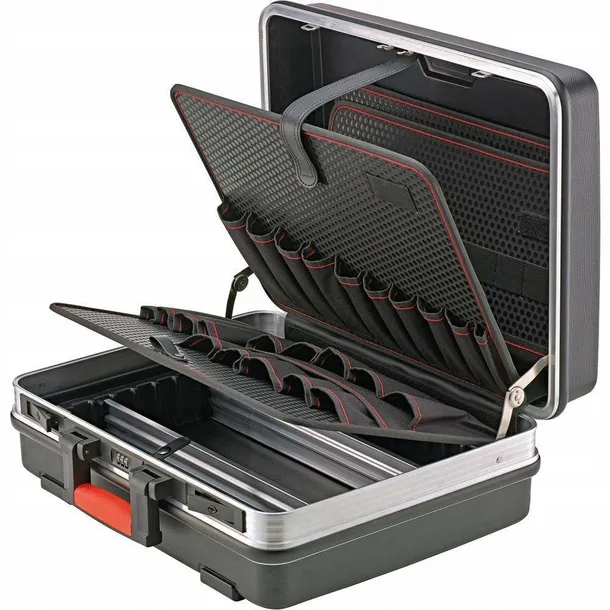 Wykonanie: z odpornego na zużycie i wilgoć tworzywa sztucznego ABS w kolorze czarnym, z wytrzymałymi ściankami ze specjalnego tworzywa sztucznego, odpornego na zarysowania, odkształcenia i deformacje, działanie wilgoci, smarów i chemikaliów, stabilny uchwyt z wygodną, miękką wkładką. Wysokość części spodniej 58 mm, z możliwością dowolnego podziału wnętrza. Zakryte zawiasy ustalające, mechanizm utrzymujący walizkę w pozycji otwartej, wytrzymałość obciążeniowa walizki do 25 kg, podwójna rama aluminiowa z zabezpieczeniem przeciwwstrząsowym. Bardzo stabilna, ze zintegrowanymi ślizgaczami zabezpieczającymi spód. Zamykana na 2 klawiszowe zamki naciskowe i zamek szyfrowy.