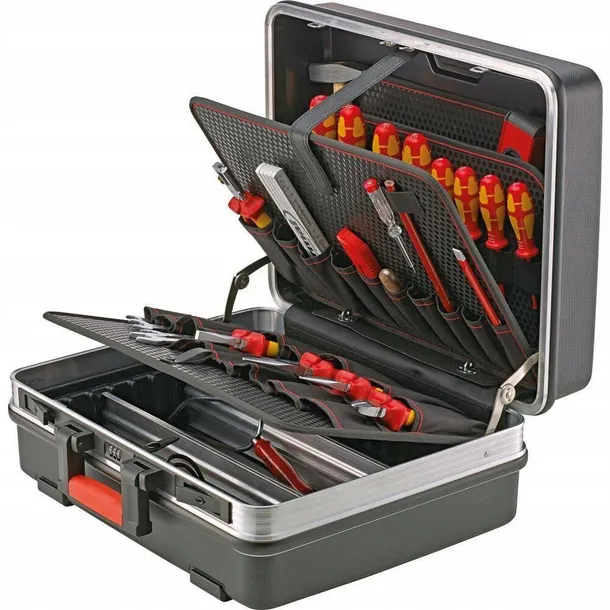 Wykonanie: z odpornego na zużycie i wilgoć tworzywa sztucznego ABS w kolorze czarnym, z wytrzymałymi ściankami ze specjalnego tworzywa sztucznego, odpornego na zarysowania, odkształcenia i deformacje, działanie wilgoci, smarów i chemikaliów, stabilny uchwyt z wygodną, miękką wkładką. Wysokość części spodniej 58 mm, z możliwością dowolnego podziału wnętrza. Zakryte zawiasy ustalające, mechanizm utrzymujący walizkę w pozycji otwartej, wytrzymałość obciążeniowa walizki do 30 kg, podwójna rama aluminiowa z zabezpieczeniem przeciwwstrząsowym. Bardzo stabilna, ze zintegrowanymi ślizgaczami zabezpieczającymi spód. Zamykana na 2 klawiszowe zamki naciskowe i zamek szyfrowy.