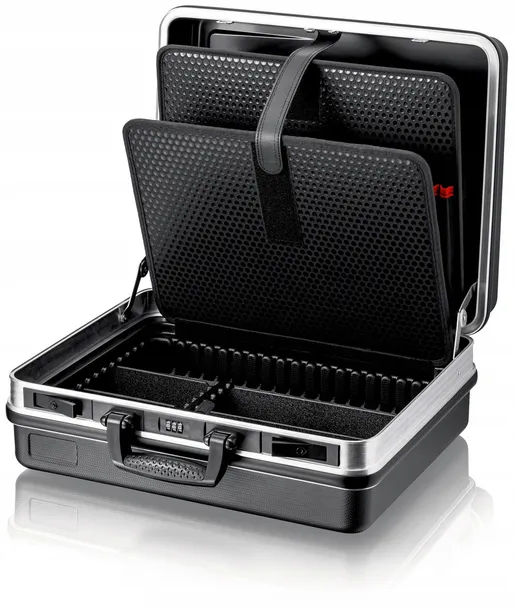 00 21 05 LE Walizka narzędziowa „Basic“ Łącznie 41 opcjonalnych wkładek. maksymalna ładowność: 15 kg. Pojemność: 27 litrów. Specjalnie wyprofilowany uchwyt zapewniający wygodne przenoszenie. Wytrzymała konstrukcja z tworzywa ABS, w kolorze czarnym. Owijana rama aluminiowa. Metalowe okucia. Kieszeń na dokumenty w pokrywie. Dwa wyjmowane panele narzędziowe wyprodukowane z zabezpieczonego przed zabrudzeniem wydrążonego arkusza polipropylenowego, 21 kieszonek narzędziowych. Dno walizki o wysokości 50 mm, które można mocować za pomocą przycisku, możliwość dalszego podziału za pomocą przekładek, panel pokrywy z 12 dużymi kieszeniami na narzędzia i jedną płaską komorą. Dwa metalowe zamki uchylne i trzycyfrowy zamek szyfrowy do bezpiecznego zamykania pokrywy. Wizytownik adresowy z dwoma plakietkami do indywidualnego etykietowania. - Szerokość zewnętrzna (wewnętrzna): 465mm 440mm - Wysokość zewnętrzna (wewnętrzna): 200mm 180mm - Głębokość zewnętrzna (wewnętrzna): 410mm 350mm / 350mm