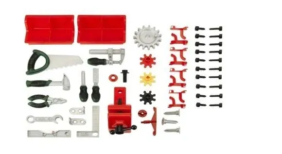 Ten warsztat zapewnia wyjątkowo dużo miejsca do zabawy, ponieważ blat ma aż 68 cm szerokości. Dodatkowo znajdują się w nim otwory do wbijania dołączonych (plastikowych) gwoździ i wkręcania śrub.