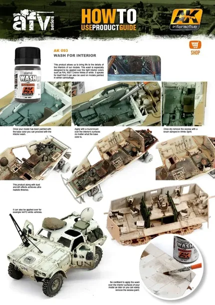 Ten produkt pozwala nam ożywić szczegóły wnętrza naszych modeli. Wash ten jest specjalnie zaprojektowany do stosowania w jasnych kolorach wnętrz, takich jak Cremeweiss RAL9001 lub biały. Z tego powodu możemy go również używać w zimowych zakamuflowanych samochodach. Idealny w celu gromadzenia brudu na detalach w jasnych kolorach. Podstawową techniką stosowaną do weatheringu każdego modelu jest washowanie, klasyczna technika która jest nadal jedną z najczęściej stosowanych technik modelowania. Zastosuj washa po wstrząśnięciu butelką za pomocą dużego pędzla, aby wyłapać szczegóły i stworzyć cienie. Nadmiar washa można łatwo usunąć za pomocą czystego pędzla i White Spirit.