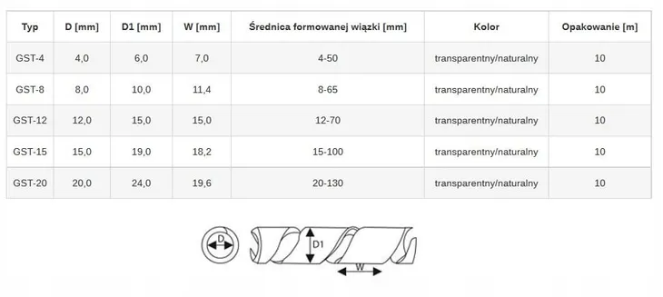 Wąż spiralny GST do oplotu wiązek przewodów. Przeznaczony jest do utrzymywania przewodów umieszczanych w urządzeniach elektrycznych w formie wiązki, jak również do ich oplotu zwiększającego mechaniczną ochronę i ułatwiającego mocowanie. Szybkie i łatwe w montażu, mogą być wielokrotnego użytku. Charakteryzują się doskonałymi właściwościami izolacyjnymi, dużą elastycznością i siłą oplotu. Do stosowania wewnątrz jak i na zewnątrz pomieszczeń. Wiązkę przewodu opleciona takim wężem można łatwo rozgałęziać w dowolnym miejscu.