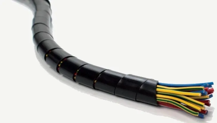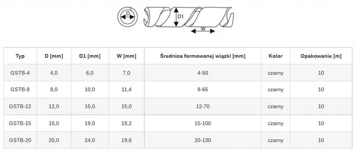 Wąż spiralny GSTB do oplotu wiązek przewodów. Przeznaczony jest do utrzymywania przewodów umieszczanych w urządzeniach elektrycznych w formie wiązki, jak również do ich oplotu zwiększającego mechaniczną ochronę i ułatwiającego mocowanie. Szybkie i łatwe w montażu, mogą być wielokrotnego użytku. Charakteryzują się doskonałymi właściwościami izolacyjnymi, dużą elastycznością i siłą oplotu. Do stosowania wewnątrz jak i na zewnątrz pomieszczeń. Wiązkę przewodu opleciona takim wężem można łatwo rozgałęziać w dowolnym miejscu.