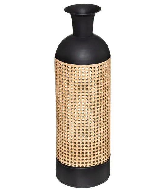 Oryginalny, modny i nowoczesny wazon Arabela to idealne uzupełnienie rustykalnego wystroju wnętrza. Wykonany z malowanego metalu o delikatnym wykończeniu na czarno, wazon przyciąga wzrok swoim prostym, cylindrycznym designem. Jego wysoka, rozszerzana szyjka ułatwia stylowe aranżacje z bukietami kwiatów. Dzięki trzcinnemu akcentowi, staje się niezapomnianym elementem dekoracyjnym w każdym pomieszczeniu.
