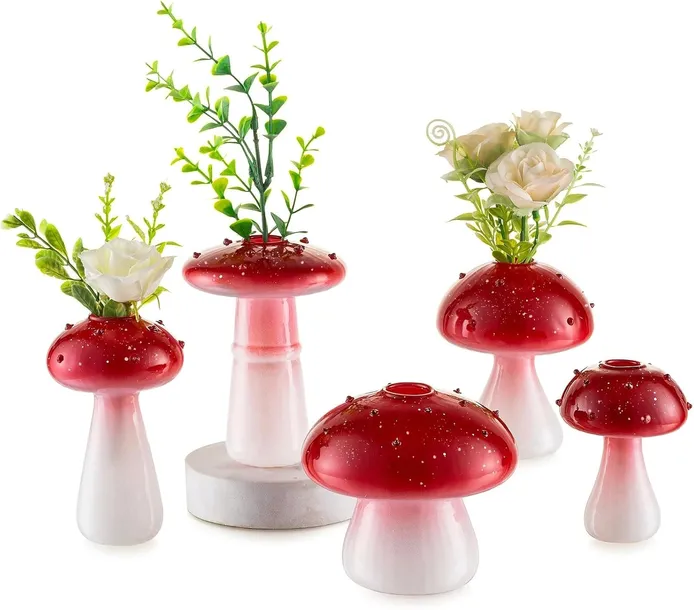 - Piękny szklany wazon z grzybami: Te modne mini wazony o różnych kształtach i rozmiarach grzybów nadają eklektyczny i naturalny charakter, dodają uroczego i fajnego uroku każdemu pomieszczeniu. Szklane wazony na kwiaty są wystarczająco eleganckie, aby docenić je samodzielnie, a jednocześnie podkreślają wyjątkowe piękno Twoich roślin w połączeniu z kwiatami.