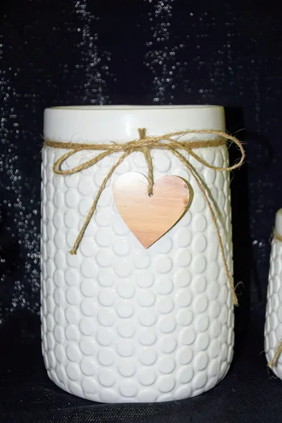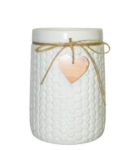Ceramiczny wazon w BIAŁYM kolorze, ozdobiony sznurkiem jutowym i drewnianą przywieszką w kształcie serca