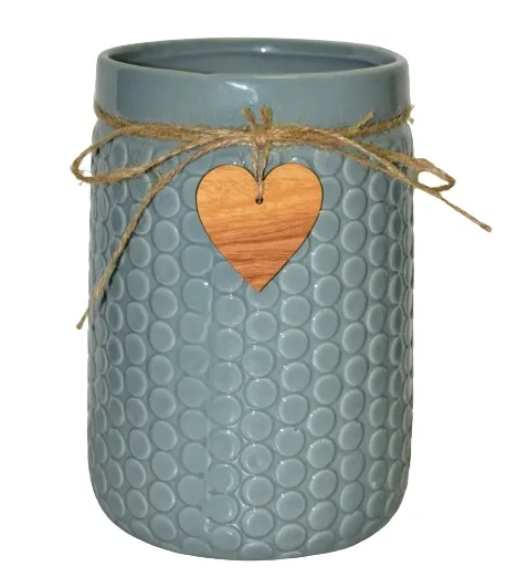 - z ozdobiony sznurkiem jutowym i drewnianą przywieszką w kształcie serca