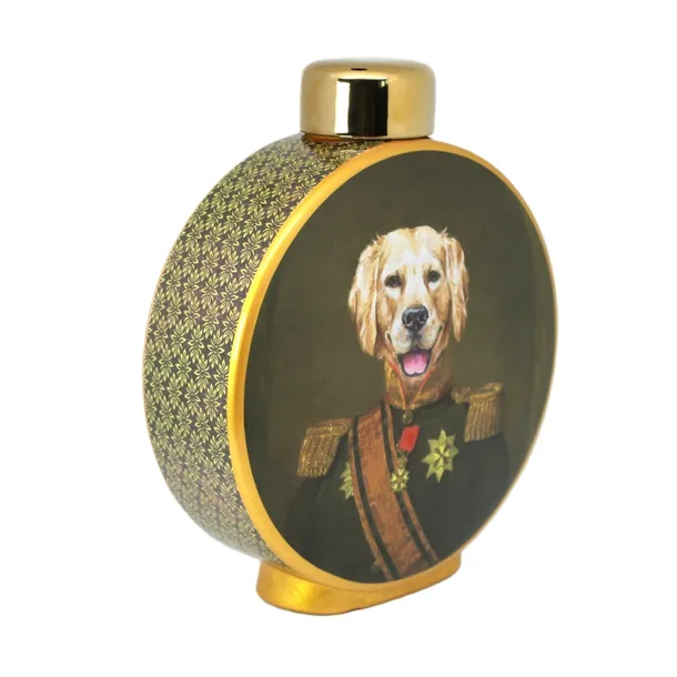 - Przód: Ilustracja psa w dostojnym mundurze z detalami w stylu renesansowym, przyciąga wzrok i stanowi centralny punkt dekoracji.