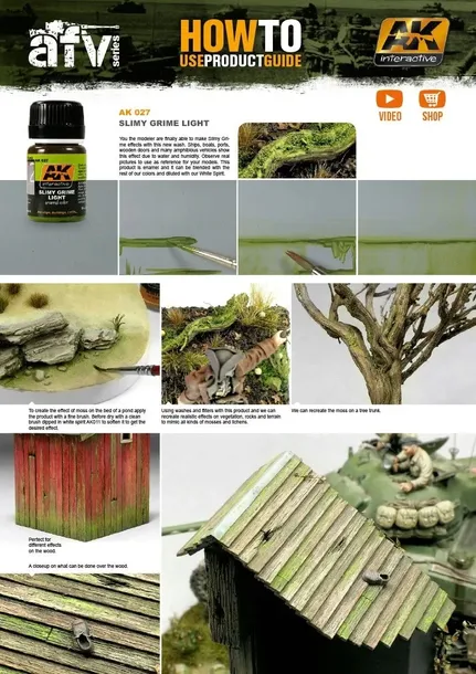Ten jasnozielony efekt jest idealny do tworzenia mchu i śliskich powierzchni spowodowanych wilgocią. Nakładać pędzlem lub aerografem, a następnie blaknąć czystym pędzelkiem zwilżonym w rozcieńczalniku do emalii. Statki, łodzie, porty, drewniane drzwi i wiele pojazdów amfibijnych wykazują ten efekt szczególnie ze względu na wodę i wilgotność. Obserwuj prawdziwe zdjęcia, aby używać ich jako odnośników w swoich modelach. Możesz połączyć z produktem "Slimy grime dark".