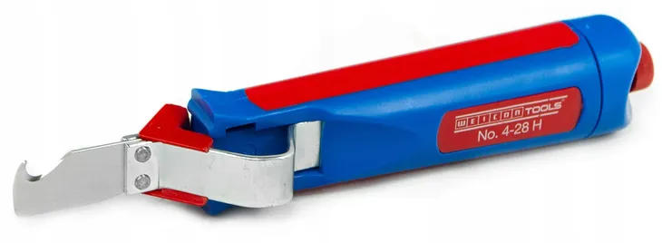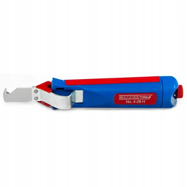 Nóż do ściągania izolacji WEICON Nr 4 - 28 H jest stosowany do usuwania osłonek wielu różnych przewodów jedno-, wielo- żyłowych z izolacją standardową w zakresie średnicy od 4 do 28 mm. System do ściągania izolacji sprawia, że praca tym narzędziem jest prosta i efektywna. Płynnie regulowane i łatwe w obsłudze pokrętło nastawne umożliwia dopasowanie głębokości z jaką nóż nacina izolację przewodu. Narzędzie ma wbudowane ostrze hakowe zabezpieczone osłoną. Może ono działać jak obcinak do drutu miedzianego i aluminiowego. Duża średnica uchwytu zapewnia pewny chwyt i przyjemną pracę. Smukła główka umożliwia pracę w trudno dostępnych miejscach Nóż WEICON jest stosowany zarówno w handlu, jak i w przemyśle i nadają się również do użytku prywatnego.