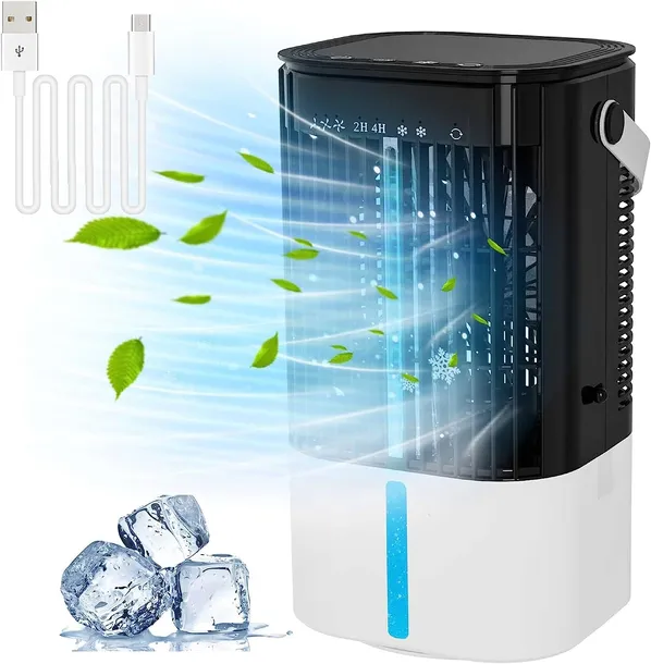 Mini Klimatyzacja 4 w 1 to połączenie mini klimatyzatora i nawilżacza, wyposażonego w klimatyzator, chłodnicę powietrza, nawilżacz, wentylator nebulizacyjny i światło LED. Dodaj kostki lodu/wody/olejku eterycznego, nawilża i odświeża/oczyszcza powietrze. Idealny do odpoczynku w sypialni, pracy w biurze, relaksu w domu i aktywności na świeżym powietrzu.