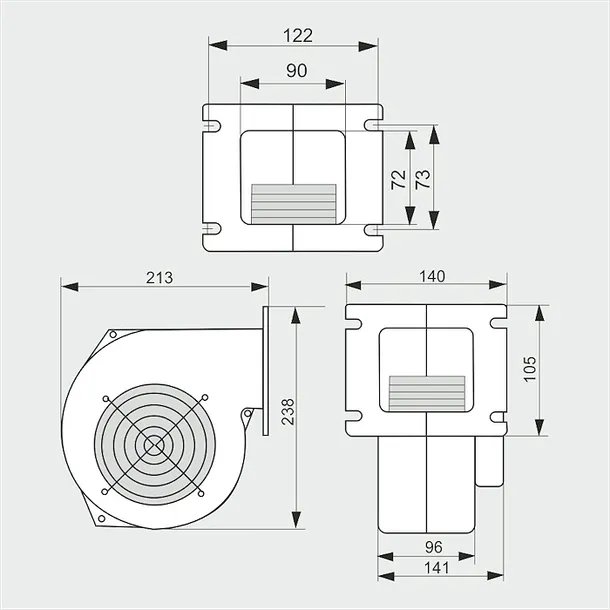 Wentylator składa się z dwóch części obudowy aluminiowej, w której zamocowany jest silnik indukcyjny. Otwór wlotowy zabezpieczony jest siatką. Otwór wylotowy zakończony jest kołnierzem z otworami do mocowania.