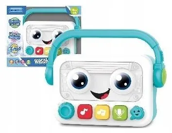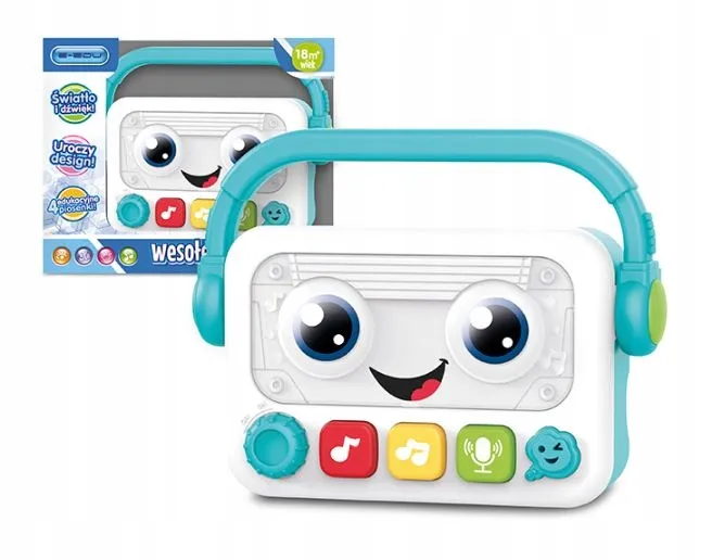 Funkcje: czerwony przycisk: dźwięki audycji z motywami muzycznymi; żółty przycisk: krótkie frazy, 4 piosenki: Dzięcioł stuka, 1,2,3 - liczysz ty!, Tęcza kolorów ma siedem, Ach gimnastyka!; zielony przycisk: naciśnij i mów radyjko powtórzy to co powiesz; efekty świetlne (dioda w okolicach ust); ruchome oczy, ruchomy uchwyt, pokrętło on/off; Pozostałe informacje: wym. zabawki: 17,5 x 13,5 x 5,5 cm., wym. opakowania: 22 x 18 x 7 cm., baterie: 2 x AA załączone demonstracyjne, 18M+