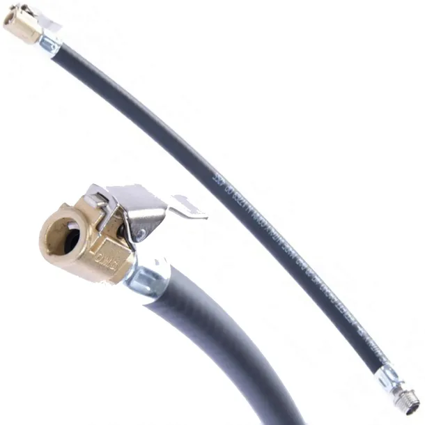 Wysokiej jakości włoski przewód gumowy do pompowania zakuty w standardową końcówkę do pompowania, która pasuje do większości wentyli samochodowych, motocyklowych i rowerowych. Wężyk zakończony gwintem zewnętrznym 1/4".