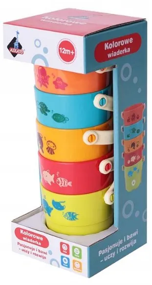 Zestaw 5 wiaderek z uchwytami do zabawy i kąpieli.