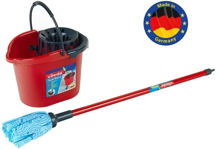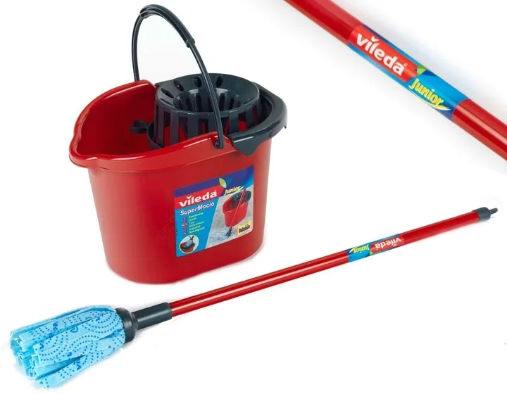 Ten autentyczny zestaw do sprzątania Klein na licencji Vileda to wierną replika profesjonalnego sprzętu dla dorosłych. Wykonany z wysokiej jakości materiałów, zawiera mop z solidnym czerwonym kijem, końcówką z trwałego niebieskiego materiału oraz funkcjonalne czerwone wiaderko z ergonomiczną rączką i czarnym wyciskaczem. Pojemność około 2 litrów zapewnia pełną funkcjonalność podczas zabawy.