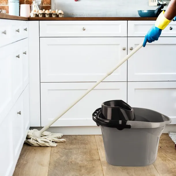 WYTRZYMAŁY - Wykonane z najwyższej jakości tworzywa w kolorze szarym, uchwyt i nakładka do wyciskania mopa w czarnym kolorze.