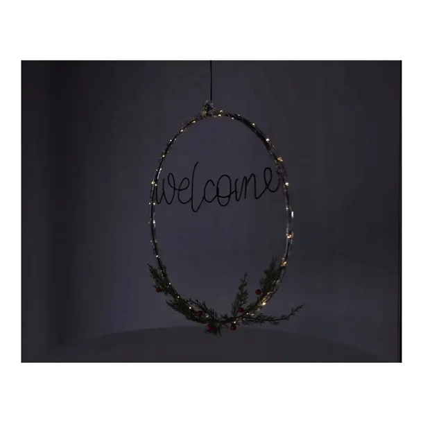 Dekoracja wisząca w formie wianka z czarnego drutu metalowego o średnicy 40 cm z napisem "WELCOME" z oświetleniem LED.
