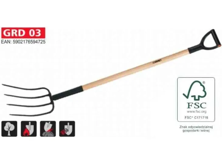 Widły gospodarcze 4-zębne Widły gospodarcze 4-zębne to niezastąpiony sprzęt w każdym gospodarstwie domowym. Dzięki nim można wygodnie przenosić, układać i porządkować różnego rodzaju materiały, takie jak siano, słoma, liście czy gałęzie. Są nieocenione podczas prac ogrodowych, w sadzie czy na polu. Najważniejsze cechy i parametry wideł gospodarczych 4-zębnych: Trzonek z lakierowanego drewna bukowego, który zapewnia wytrzymałość i trwałość. Rękojeść profilowana, wykonana z tworzywa HDPE, co gwarantuje komfort użytkowania i pewny chwyt. Głowica hartowana, wykonana z wytrzymałej na odkształcenia stali węglowej, dzięki czemu widły są odporne na uszkodzenia i długotrwałe użytkowanie. Te widły gospodarcze są nie tylko funkcjonalne, ale także estetyczne. Drewniany trzonek nadaje im elegancki wygląd, który doskonale komponuje się z innymi narzędziami ogrodowymi. Zamów już teraz i korzystaj z zalet, jakie dają te widły gospodarcze: Przenoś różnego rodzaju materiały bez wysiłku i zwiększ swoją wydajność. Zaoszczędź czas i energię podczas prac ogrodowych czy gospodarczych. Dzięki solidnemu wykonaniu, widły będą służyć Ci przez wiele lat, zapewniając niezawodność i trwałość. Wygodna rękojeść zapewni Ci komfort i pewny chwyt podczas pracy. Nie czekaj! Zamów te widły gospodarcze 4-zębne już teraz i ciesz się ich niezawodnością i wygodą użytkowania!