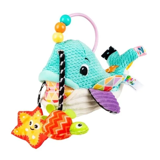 Koleżka wprost z morskich głębin zabawi sensorycznie i to na różne sposoby! Wieloryb wyposażony został w tasiemkę do przeciągania z doczepionymi do niej dwoma kształtami: szeleszczącą rozgwiazdą i kolorowym żółwiem. Ciałko wieloryba zostało uszyte z materiałów o zróżnicowanych fakturach i ozdobione dodatkowo kolorowymi metkami, dzięki czemu jego głaskanie będzie stymulować zmysł dotyku malucha. Na boku Waldusia znajduje się miękki gryzaczek, a jego głowę zdobi praktyczny uchwyt z koralikami do przesuwania paluszkiem. Ta urocza zabawka w kolorowym opakowaniu będzie świetnym prezentem dla małych miłośników morskich zwierzaków.