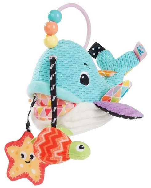 Koleżka wprost z morskich głębin zabawi sensorycznie i to na różne sposoby! Wieloryb wyposażony został w tasiemkę do przeciągania z doczepionymi do niej dwoma kształtami: szeleszczącą rozgwiazdą i kolorowym żółwiem. Ciałko wieloryba zostało uszyte z materiałów o zróżnicowanych fakturach i ozdobione dodatkowo kolorowymi metkami, dzięki czemu jego głaskanie będzie stymulować zmysł dotyku malucha. Na boku Waldusia znajduje się miękki gryzaczek, a jego głowę zdobi praktyczny uchwyt z koralikami do przesuwania paluszkiem. Ta urocza zabawka w kolorowym opakowaniu będzie świetnym prezentem dla małych miłośników morskich zwierzaków.