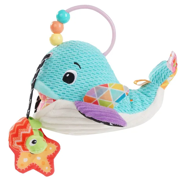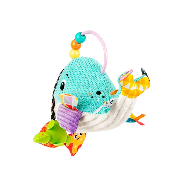 Koleżka wprost z morskich głębin zabawi sensorycznie i to na różne sposoby! Wieloryb wyposażony został w tasiemkę do przeciągania z doczepionymi do niej dwoma kształtami: szeleszczącą rozgwiazdą i kolorowym żółwiem. Ciałko wieloryba zostało uszyte z materiałów o zróżnicowanych fakturach i ozdobione dodatkowo kolorowymi metkami, dzięki czemu jego głaskanie będzie stymulować zmysł dotyku malucha. Na boku Waldusia znajduje się miękki gryzaczek, a jego głowę zdobi praktyczny uchwyt z koralikami do przesuwania paluszkiem. Ta urocza zabawka w kolorowym opakowaniu będzie świetnym prezentem dla małych miłośników morskich zwierzaków.