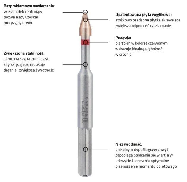- Wierzchołek centrujący, pozwalający uzyskać precyzyjny otwór.