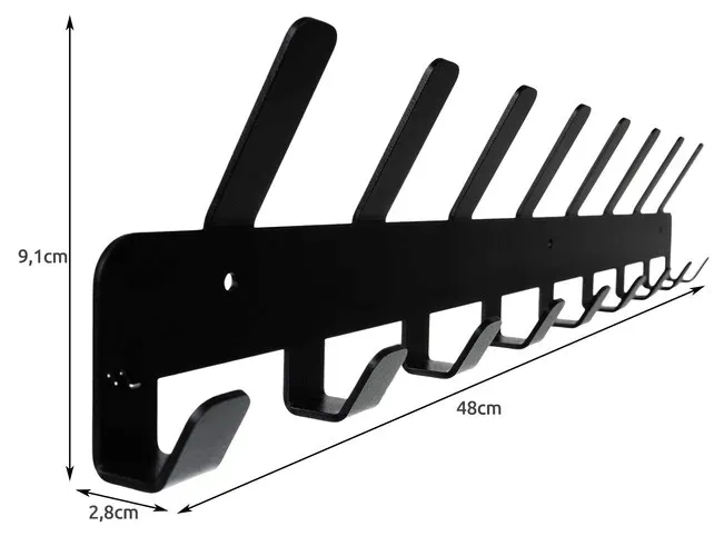 - SPECYFIKACJA - kolor: czarny; materiał: stal malowana proszkowo; 17 haczyków; wymiary: 9,1 x 48 x 2,8 cm; waga: 0,426kg; waga w opakowaniu: 0,511kg.