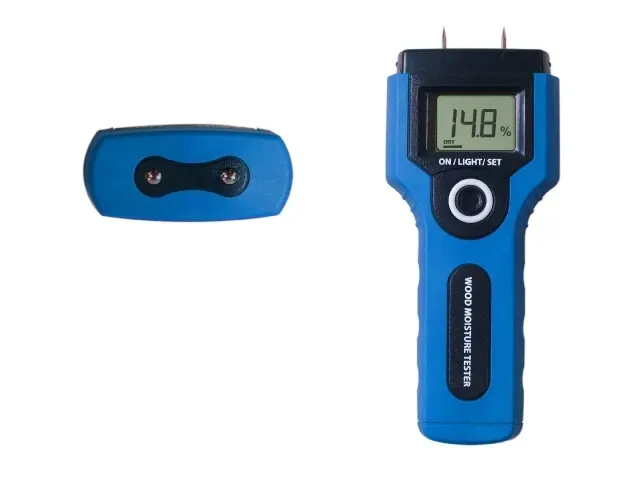 Limit Łatwy w użyciu, ręczny miernik zawartości wilgoci w drewnie, w którym pomiaru dokonuje się przez wciśnięcie w materiał dwóch kolców pomiarowych. Wynik pomiaru podawany jest bezpośrednio na wyświetlaczu LCD. Pokrywa ochronna zawiera również wyposażenie do kalibracji, zapewniające utrzymanie odpowiedniej dokładności pomiarów. Przyrząd służy do pomiarów pięciu grup materiałów, które się łatwo wybiera, stosownie do rodzaju mierzonego drewna. Wyświetlacz z cyframi o wysokości 12 mm i podświetleniem automatycznie wyłączanym po 30 s. Przeznaczony dla stolarzy, inspektorów budowlanych, pracowników drzewnych oraz właścicieli domów. Bateria w załączeniu.