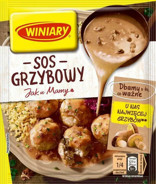 SKŁADNIKI: mąka Pszenna*, skrobia kukurydziana*, odtłuszczone Mleko w proszku*, suszone grzyby 7 % (pieczarka*, maślak*, podgrzybek*), sól, aromaty, skrobia ziemniaczana*, śmietanka w proszku* 5,4 % (z Mleka), cukier*, olej palmowy, suszony czosnek*, barwnik (karmel*), przyprawy*, liść pietruszki*, * naturalne składniki