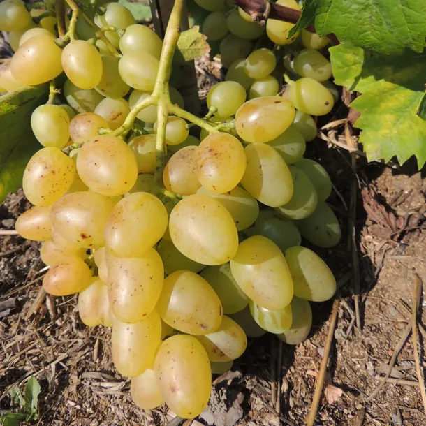 Owoce: Grona stożkowe, luźne, o masie od 500 g do nawet 1,5 kg. Jagody owalne, żółto-zielone, w pełnej dojrzałości bursztynowo-złote. Miąższ soczysty, mięsisty, bardzo smaczny. Smak harmonijny.