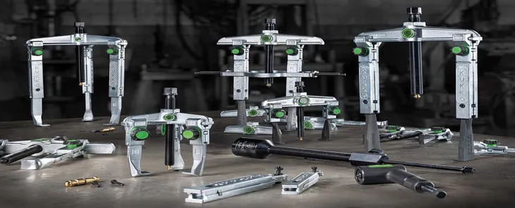 Wykonanie: Z ruchomymi ramionami. Im większa siła jest wymagana do ściągnięcia części, tym mocniej łapy ramion do ściągacza chwytają ściąganą część. Bardzo wąskie ramiona, które przez dwie lub trzy szczeliny chwytają odsadzenie wentylatora.