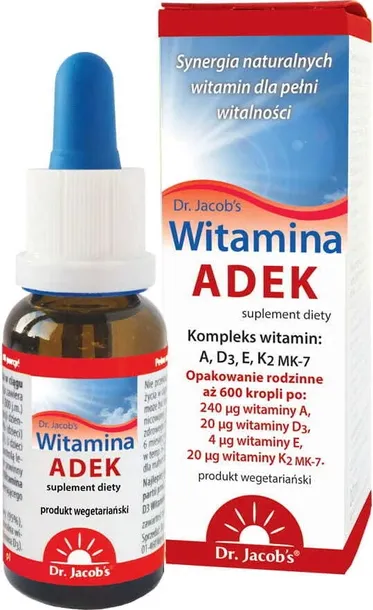 Krople Witamina ADEK Dr. Jacob’s to pierwszy taki produkt na rynku. Dzięki temu, że witaminy są rozpuszczone w oleju, już w ustach wchłaniają się bezpośrednio do krwiobiegu (z pominięciem układu pokarmowego).